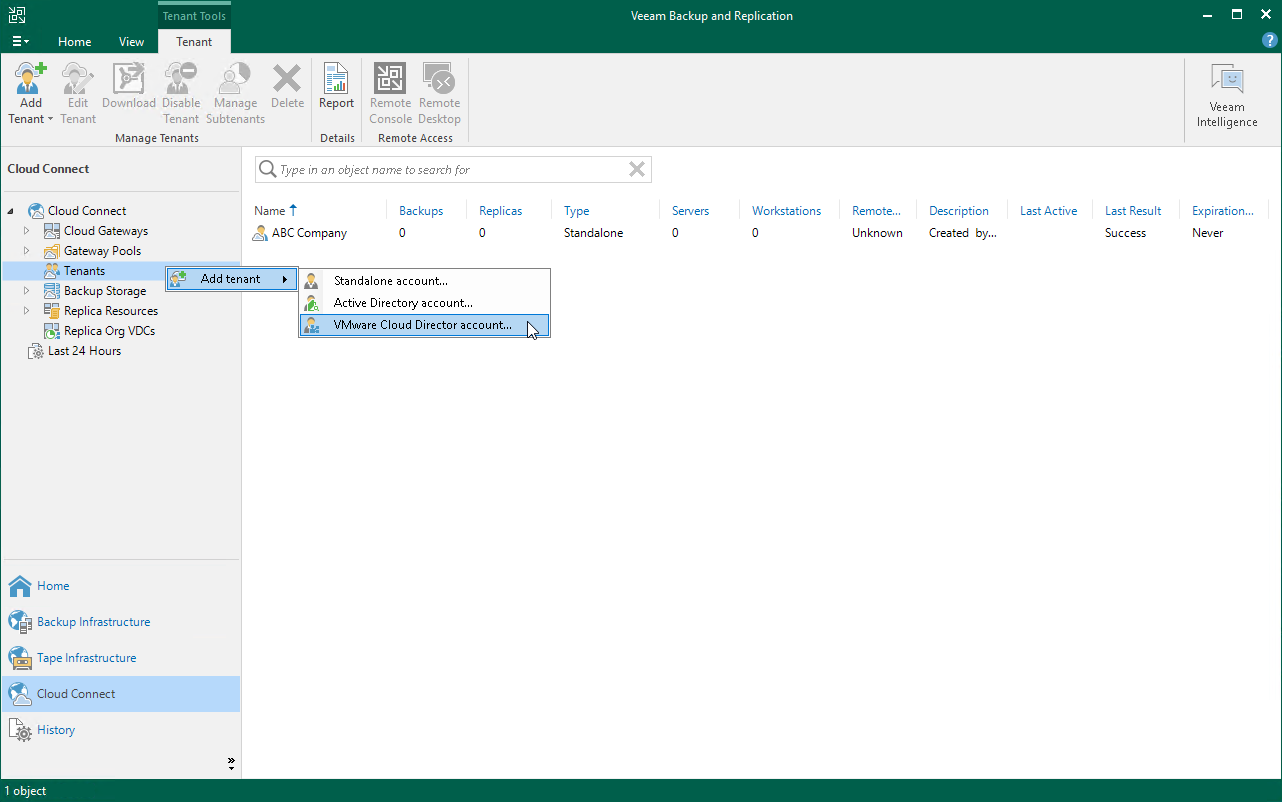 - Open the Cloud Connect view. Click the Tenants node in the inventory pane and click Add Tenant > VMware Cloud Director account on the ribbon.