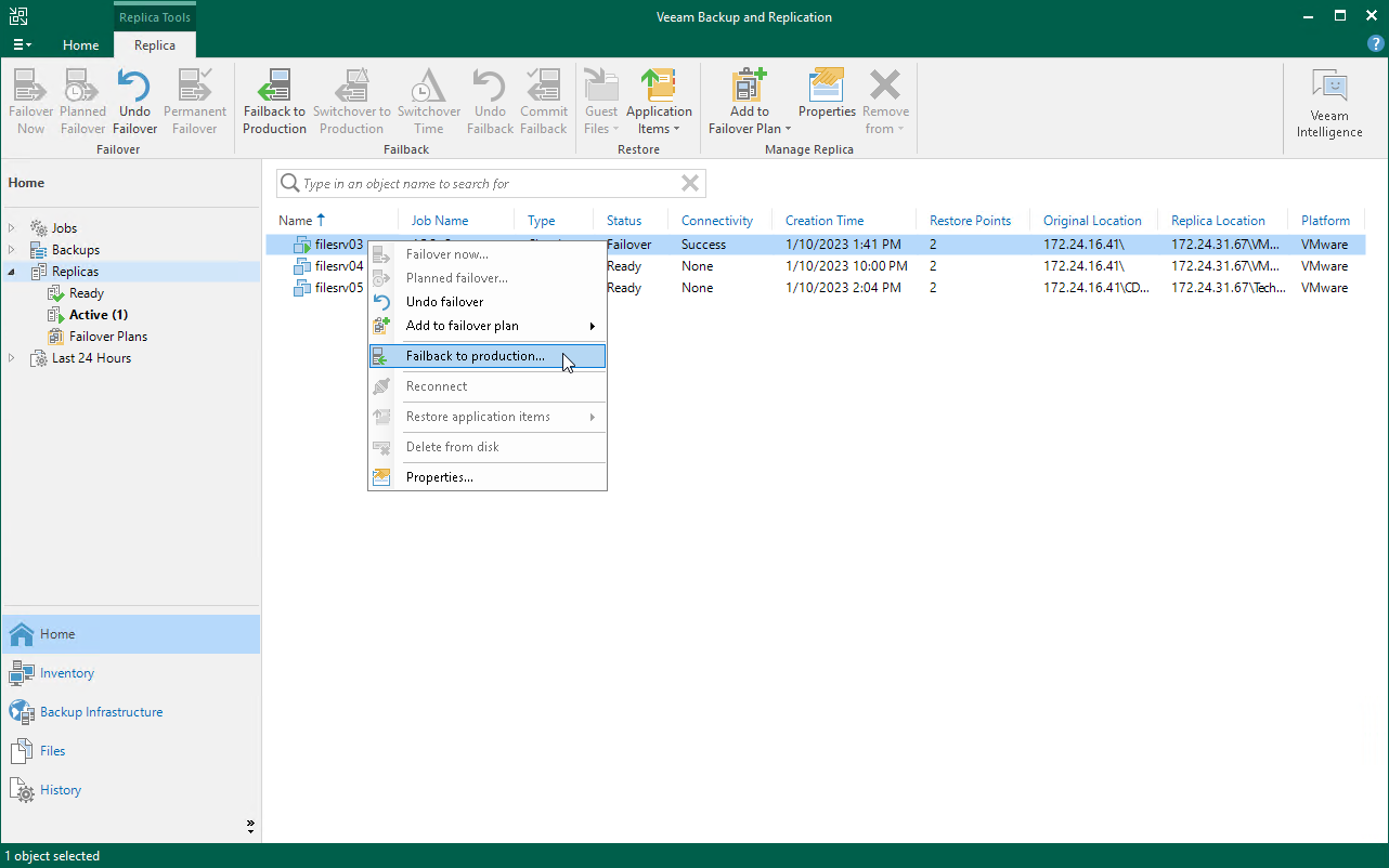 - Open the Home view and select the Replicas node. In the working area, right-click the necessary VM and select Failback to production.