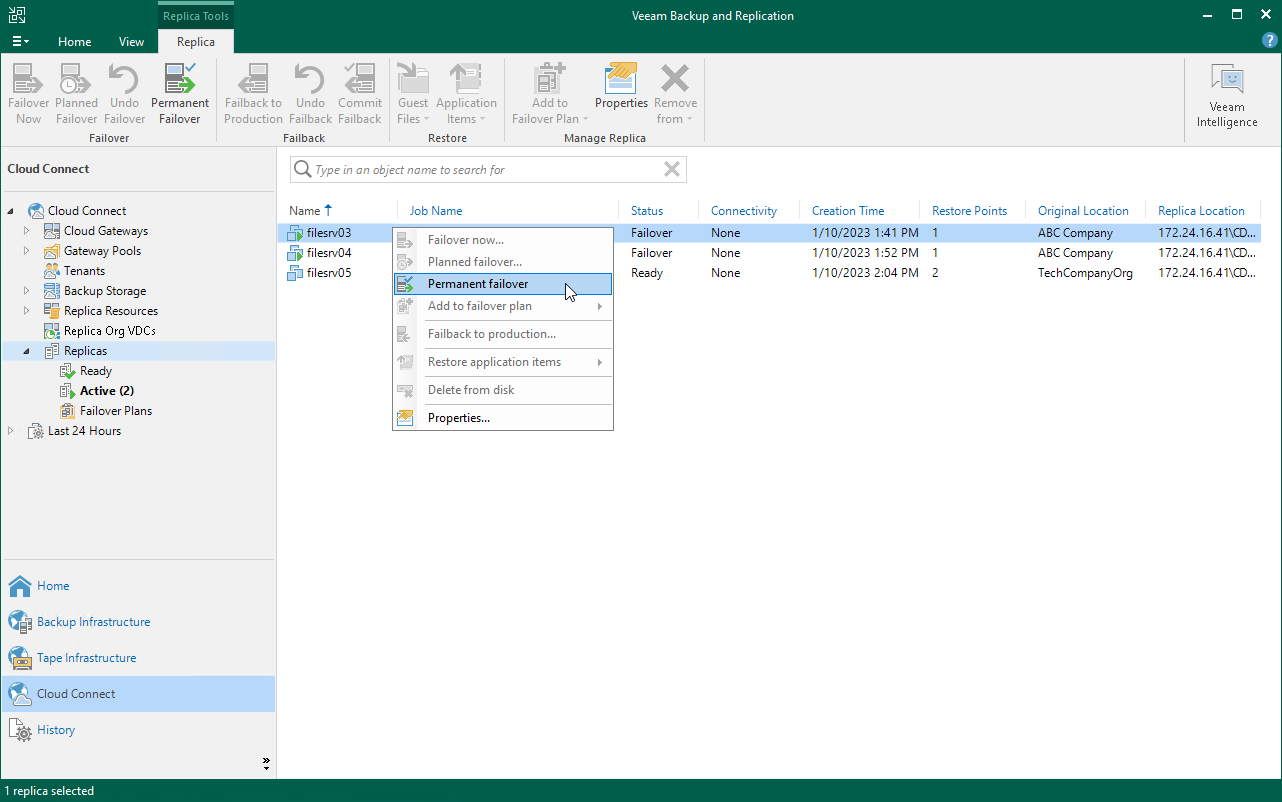 - Open the Cloud Connect view, in the inventory pane select Replicas. In the working area, right-click the necessary VM and select Permanent failover.