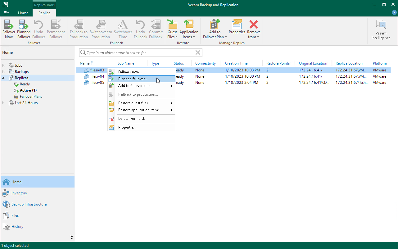 - Open the Home view and select the Replicas node. In the working area, right-click the necessary VM and select Planned failover.