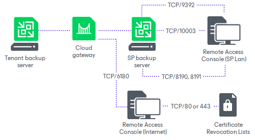 Certificate Revocation Lists | TCP | 80 or 443 (most popular) | Tenant backup server needs access to CRLs (Certificate Revocation Lists) of the CA (Certification Authority) who issued a certificate to the SP. Generally, information about CRL locations can be found on the CA website. | |