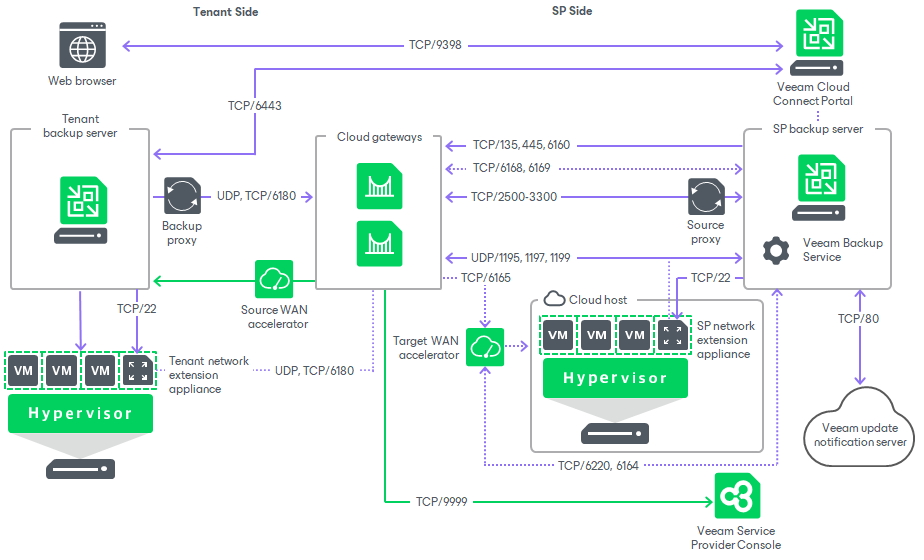 In this section, you can also find diagrams illustrating the interaction between Veeam Cloud Connect components and used ports in following scenarios: