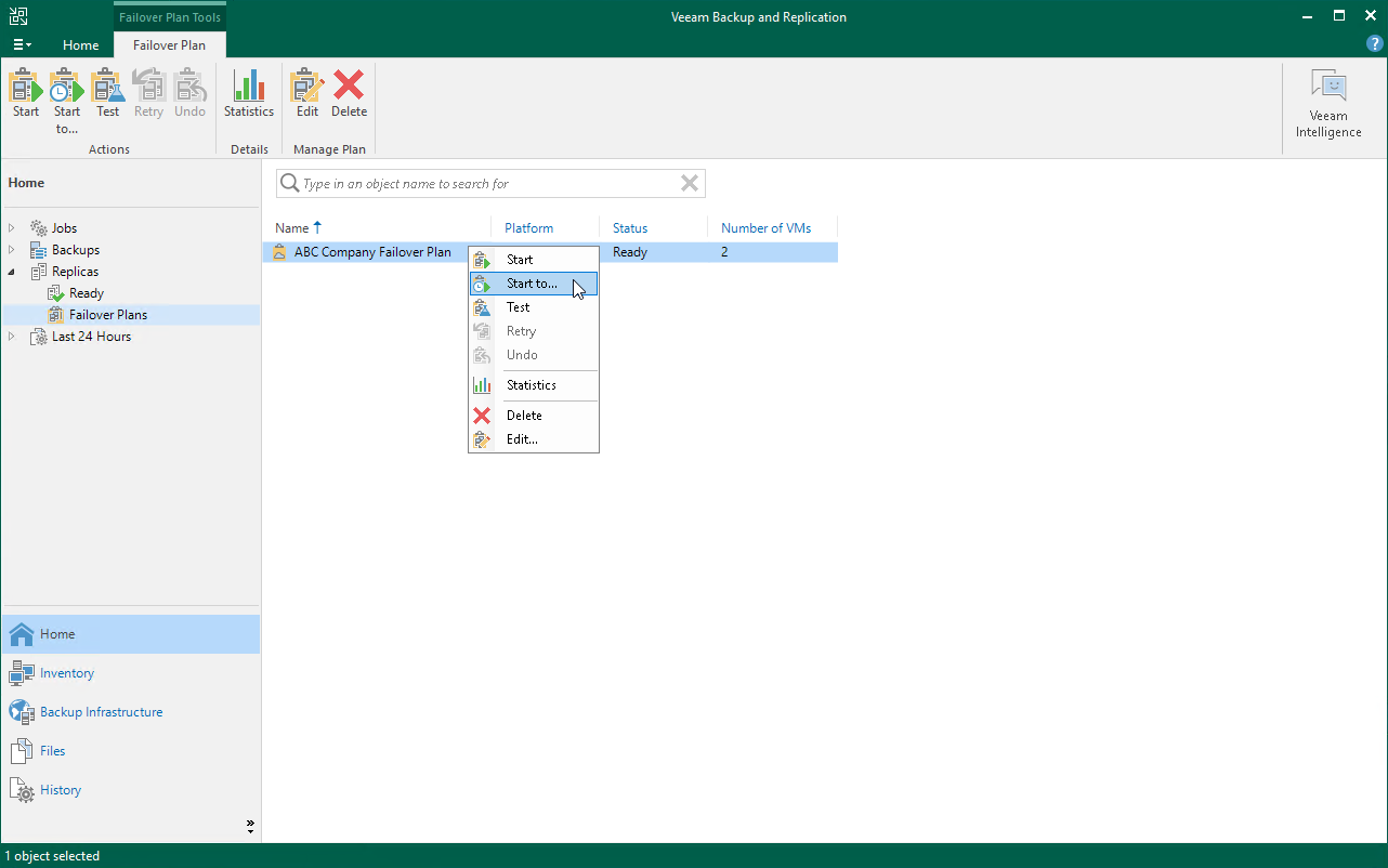 - In the working area, right-click the necessary cloud failover plan and select Start to.