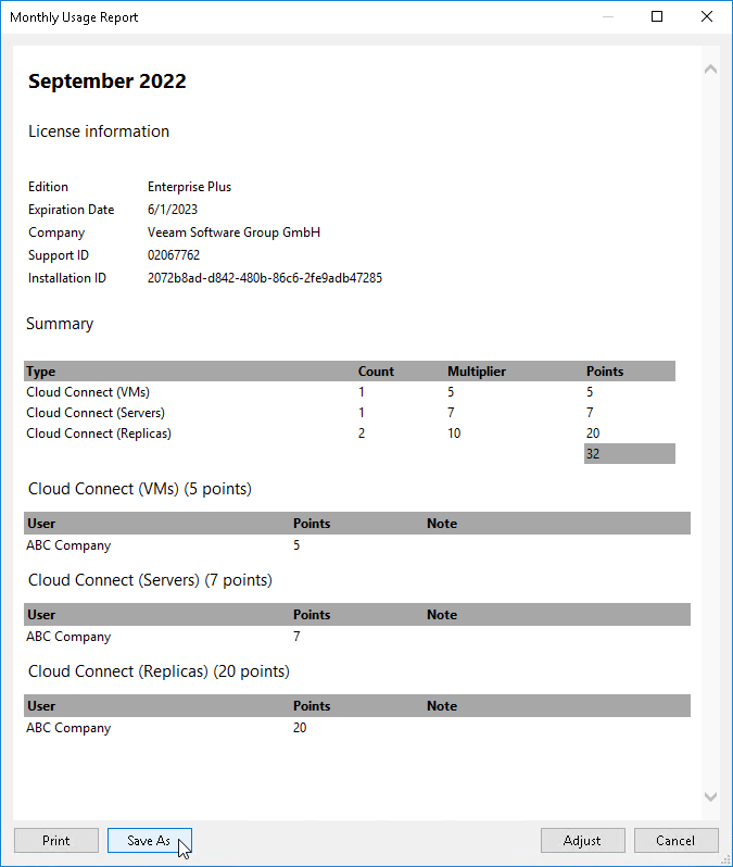 If you perform manual license usage reporting, you must save the license usage report after review for future submission. You can also save the report in case of automatic reporting, for example, to keep a copy of the report in the desired folder. You can choose to save the report to a file in the PDF format or JSON format.