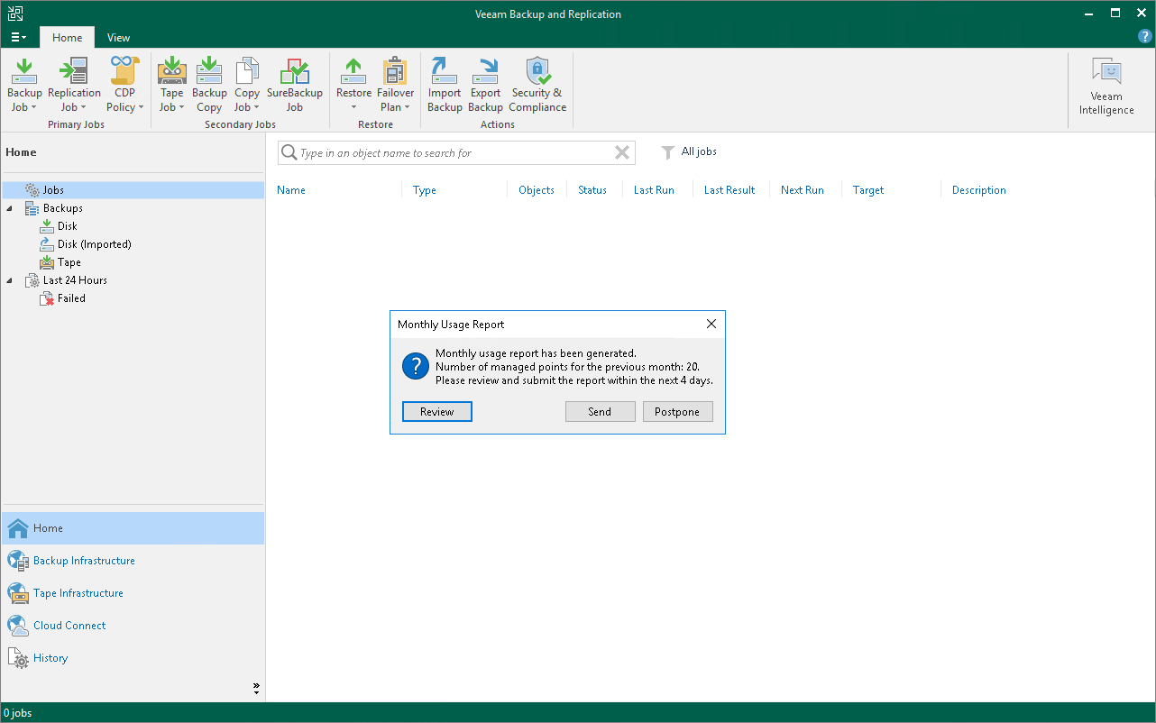 On the first day of the month, when you launch the Veeam Backup & Replication console, a window opens notifying that the license usage report has been generated. The notification reflects the number of used points for the previous month. The notification also displays the number of days within which the report must be submitted.