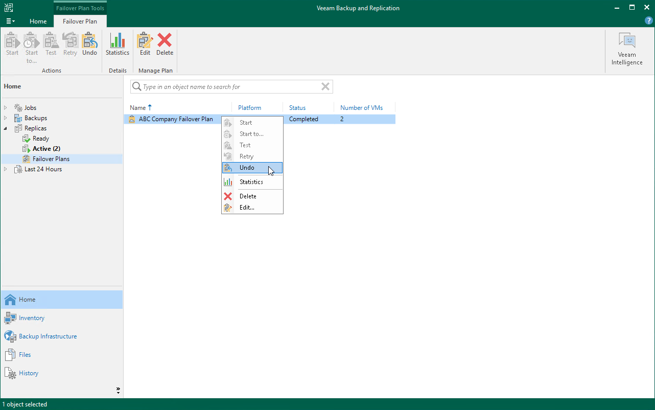 - In the working area, right-click the necessary cloud failover plan and select Undo.