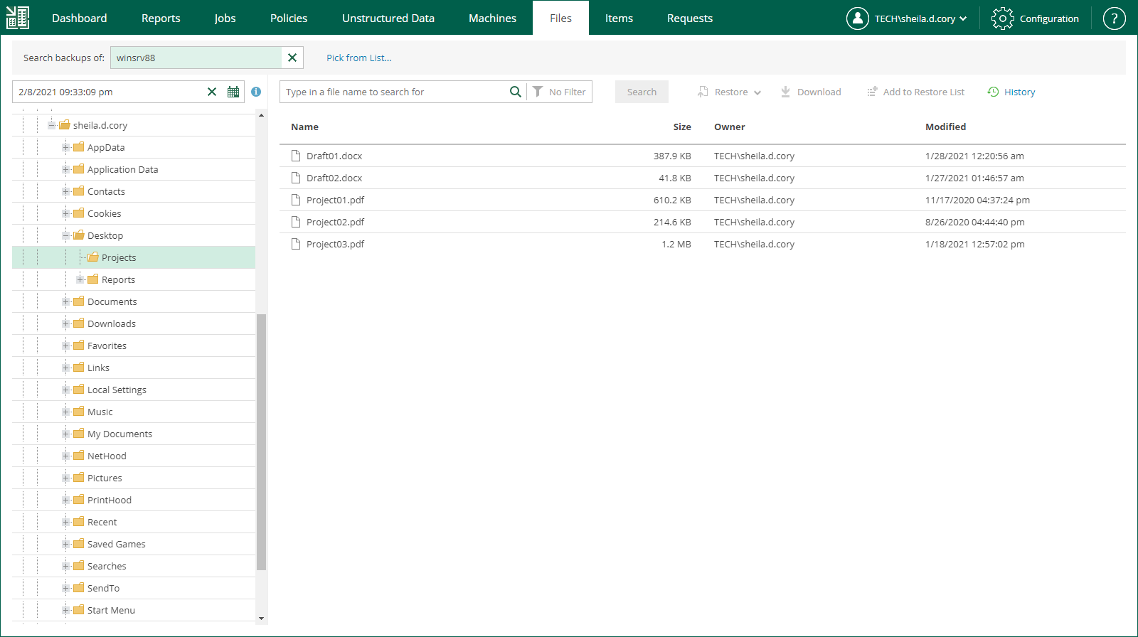 As a result, the file tree of the machine as of the selected backup and restore point date will be displayed. You can manually browse the file tree or use the search field to find a necessary file. Consider that depending on the number of files on the machine, the search process may take some time.