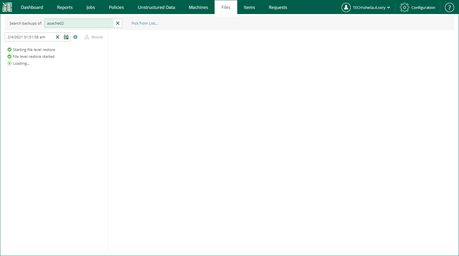 After catalog replication, you can browse any machine backup for OS guest files. Note that with the file browsing functionality, you can browse and search for files in the selected machine backup at a specific restore point only.