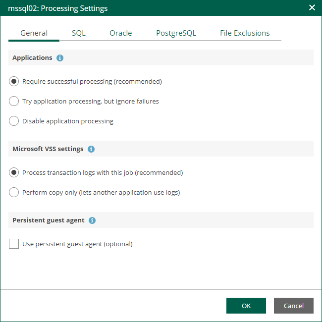 - On the General tab of the VM Processing Settings window, make sure that either the Require successful processing or Try application processing, but ignore failures option is selected.