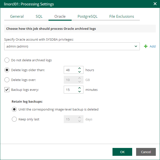 - Select Keep only last <N> days to keep archived logs for a specific number of days. By default, archived logs are kept for 15 days. If you select this option, you must make sure that retention for archived logs is not greater than retention for the image-level backups. For more information, see the Retention for Archived Log Backups section of the Veeam Backup & Replication User Guide.