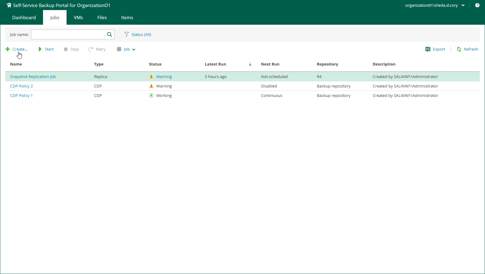 - Log in to the Veeam Self-Service Backup Portal under a Cloud Director account with proper rights.