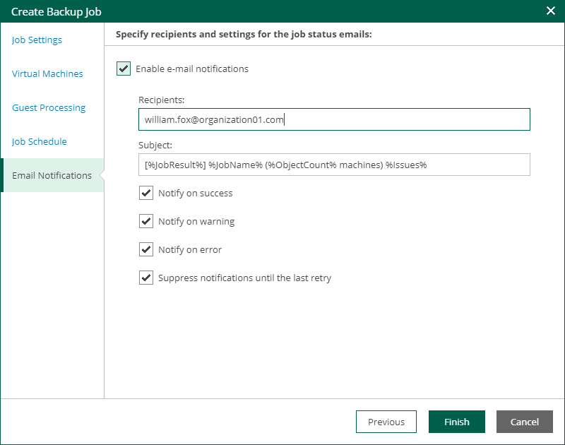 - Select the Suppress notifications until the last retry check box to receive a notification about the final job status. If you do not enable this option, Veeam Backup & Replication will send one notification per every job retry.