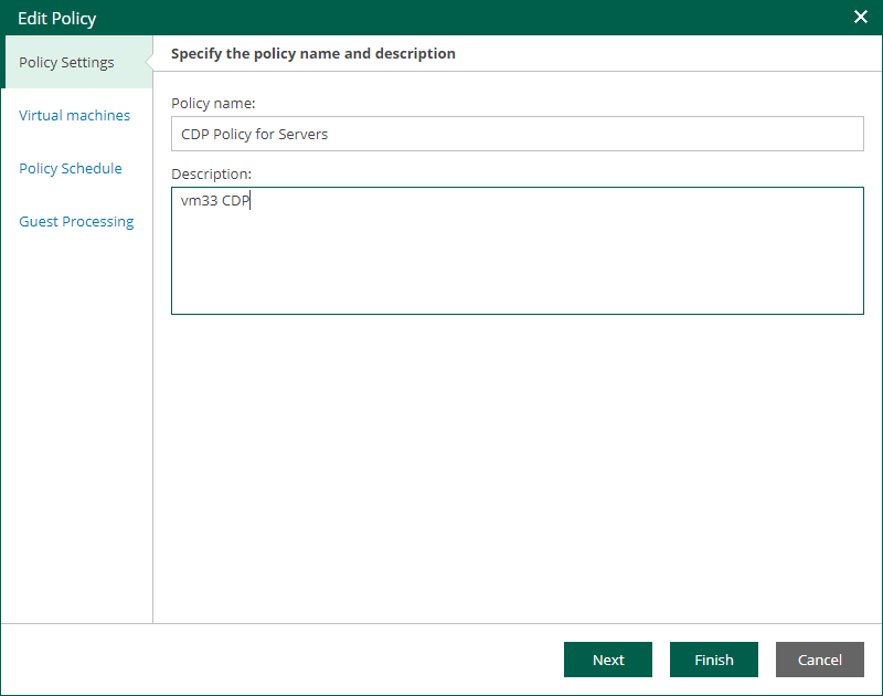 This is an archive version of the document. To get the most up-to-date information, see the current version. Step 2. Edit Policy Name and Description At the Policy Settings step of the wizard, you can modify the name and description of the selected CDP policy:In the Policy name field, specify a name for the policy.In the Description field, provide an optional description for future reference.