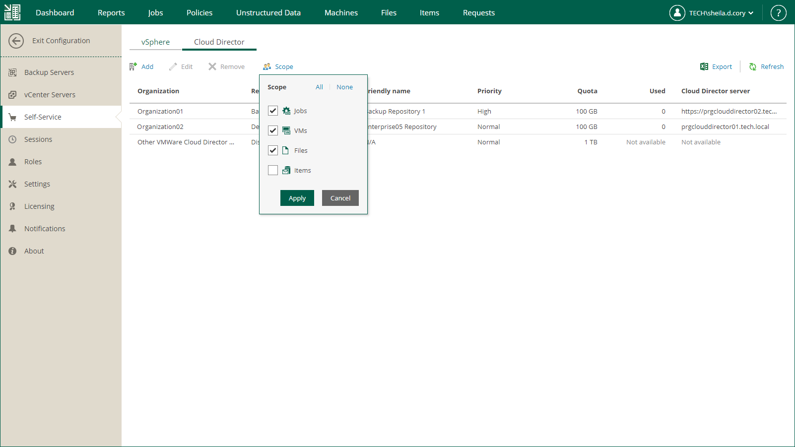 Users with the Portal Administrator role can configure what operations are available for portal users by choosing the tabs that must displayed in Veeam Self-Service Backup Portal. By default, all portal tabs are displayed. The Dashboard tab is always available in the portal. You can change visibility of the following portal tabs: