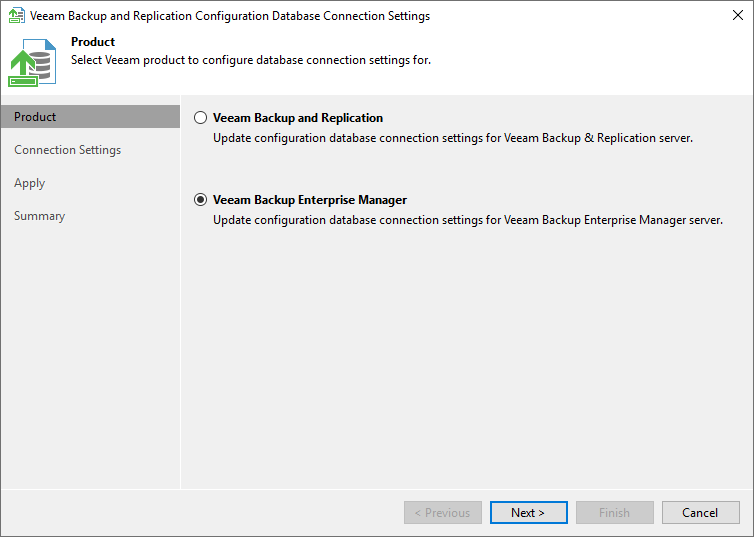 The Product step of the wizard is displayed if you have both a Veeam Backup Enterprise Manager server and backup server installed on the local machine. In this case, select a product whose configuration database settings you want to change.