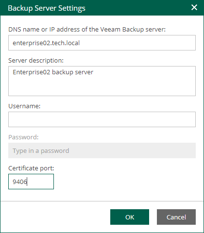 After a backup server was added to the Enterprise Manager infrastructure, you can edit connection settings. After you specify new connection settings, Enterprise Manager will try to connect to the backup server using these settings. If you specify credentials, Veeam Backup Enterprise Manager Service will send them to the backup server for the initial authentication. Otherwise, the Enterprise Manager certificate will be used.