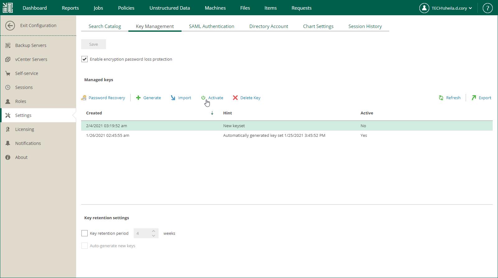 Active Enterprise Manager keys are the keys that are currently used in the encryption process. After you create a new keyset, you need to activate it. As a result of activation, Veeam Backup Enterprise Manager performs the following actions: