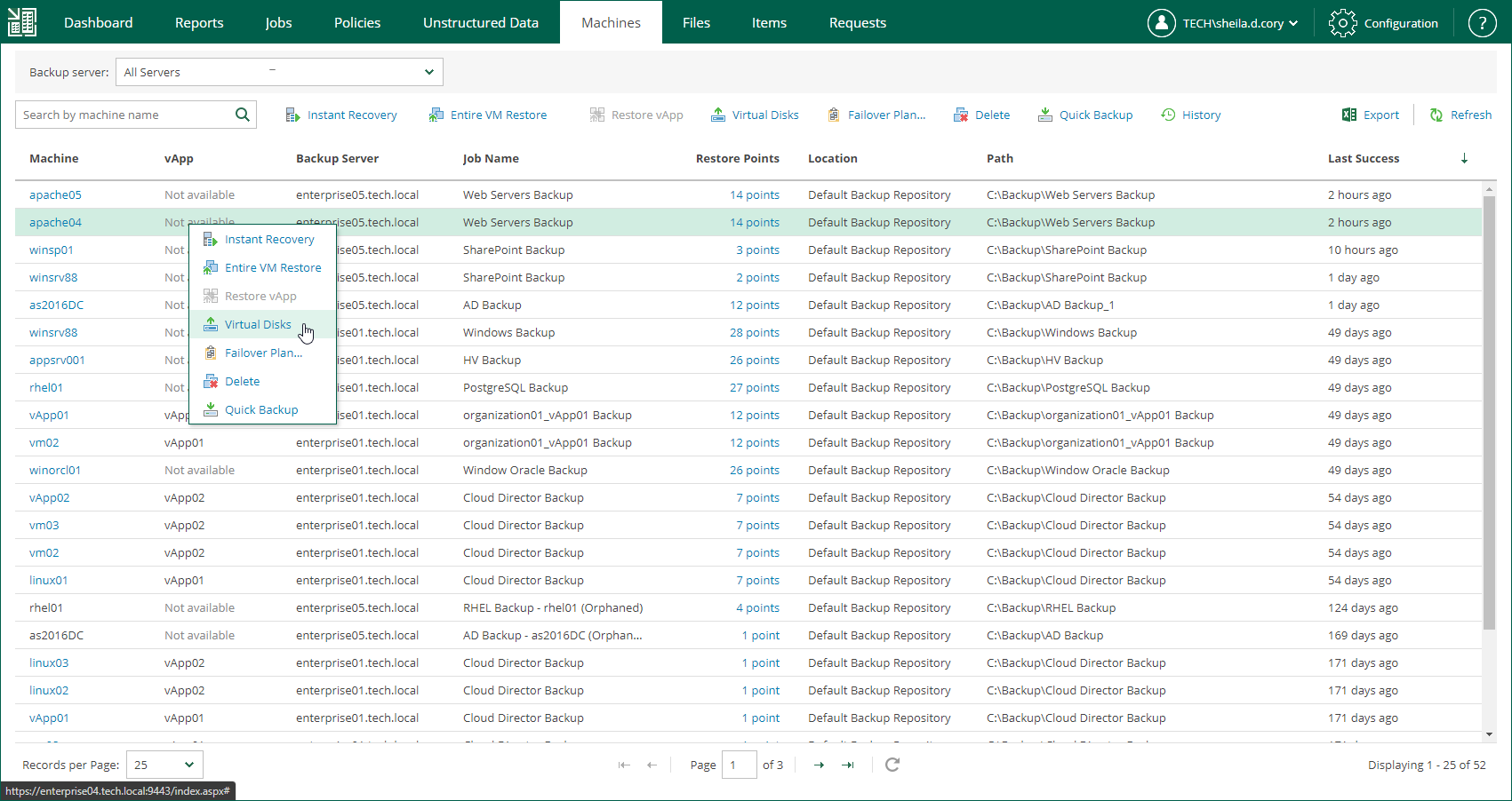 - Open the Machines tab and select the necessary VMware vSphere VM from the list.