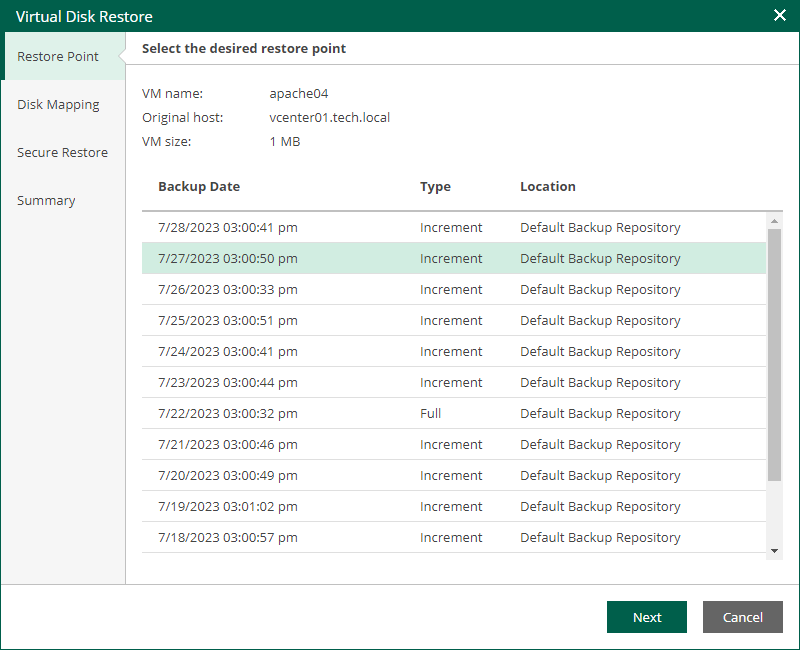 This is an archive version of the document. To get the most up-to-date information, see the current version. Step 2. Select Restore Point At the Restore Point step of the wizard, select the restore point that will be used to restore the VM disk.