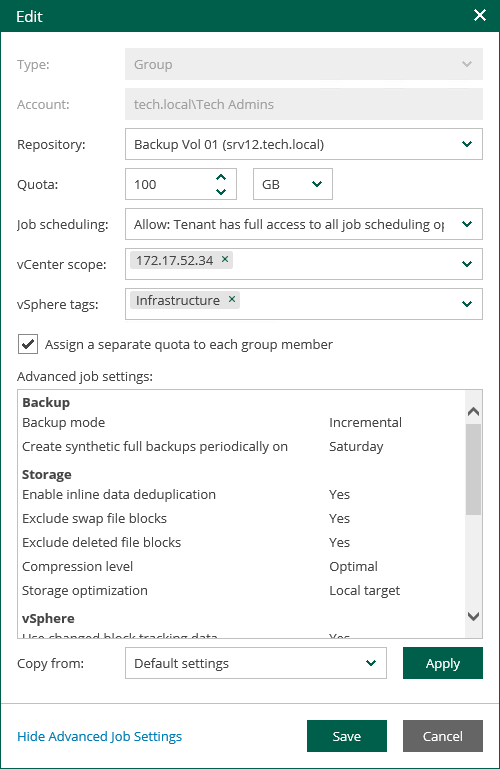 - If you plan to modify job template for a tenant account, remember that the new settings will be applied only to the new jobs created by the tenant; the changes will not affect existing jobs.