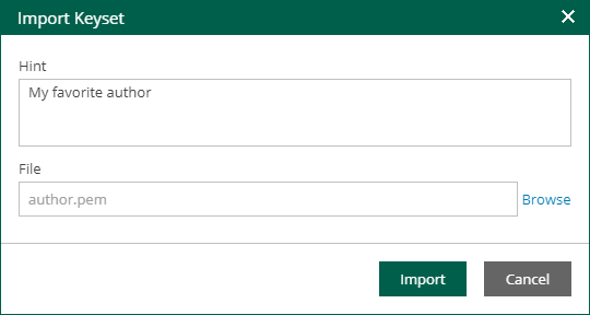 4. In the Hint field, Veeam Backup Enterprise Manager displays a hint that you provided when creating the imported keyset.