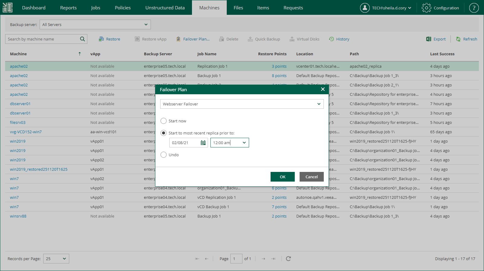 Veeam Backup Enterprise Manager allows you to carry out a failover following the existing plan, and also to undo planned failover.