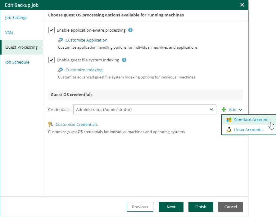 For machine guest OS indexing of Linux-based machines, a user account with root privileges on the machine is required. It is recommended that you create a separate user account for work with Veeam Backup & Replication on the Linux-based machine, grant root privileges to this account and specify settings of this account in the Guest OS credentials section.