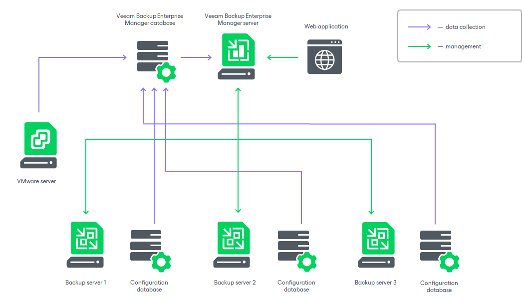- Veeam Backup Enterprise Manager retrieves data from the managed Veeam backup servers using a data collection job. This job gets information about the backup and replication jobs, processed machines, and other data from the configuration databases used by Veeam backup servers.