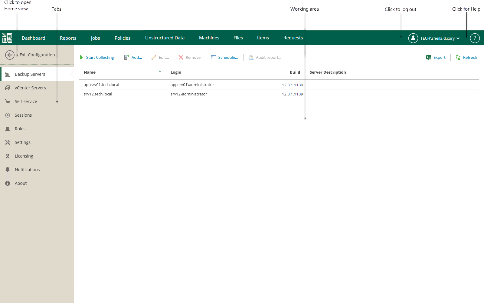 - Add, edit or remove Veeam Backup servers using the Backup Servers tab. For more information, see Managing Backup Servers.