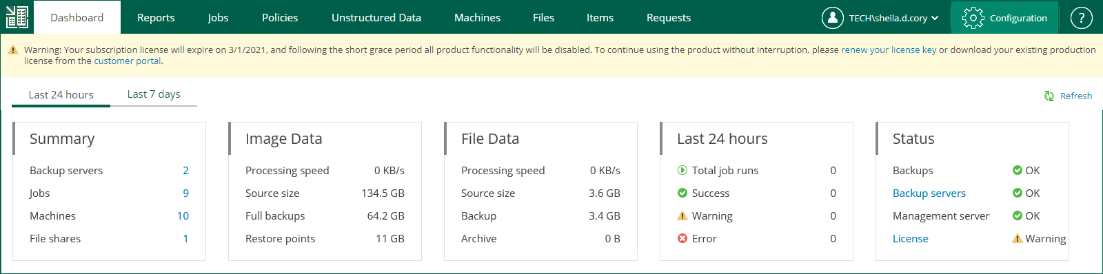 Veeam Backup Enterprise Manager supports a grace period after the license expiration date. For subscription license, it lasts for 30 days, for rental license — 2 months. During this period the product will be running, but a warning about license expiration (grace period) will appear on the Dashboard tab and in the sessions information.