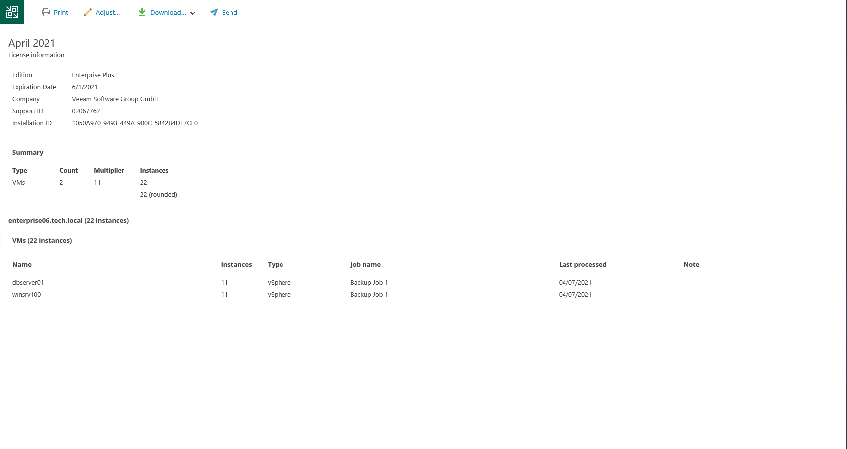 - License information: Veeam Backup & Replication edition, license expiration date, name of the company to which the license was issued and support ID.