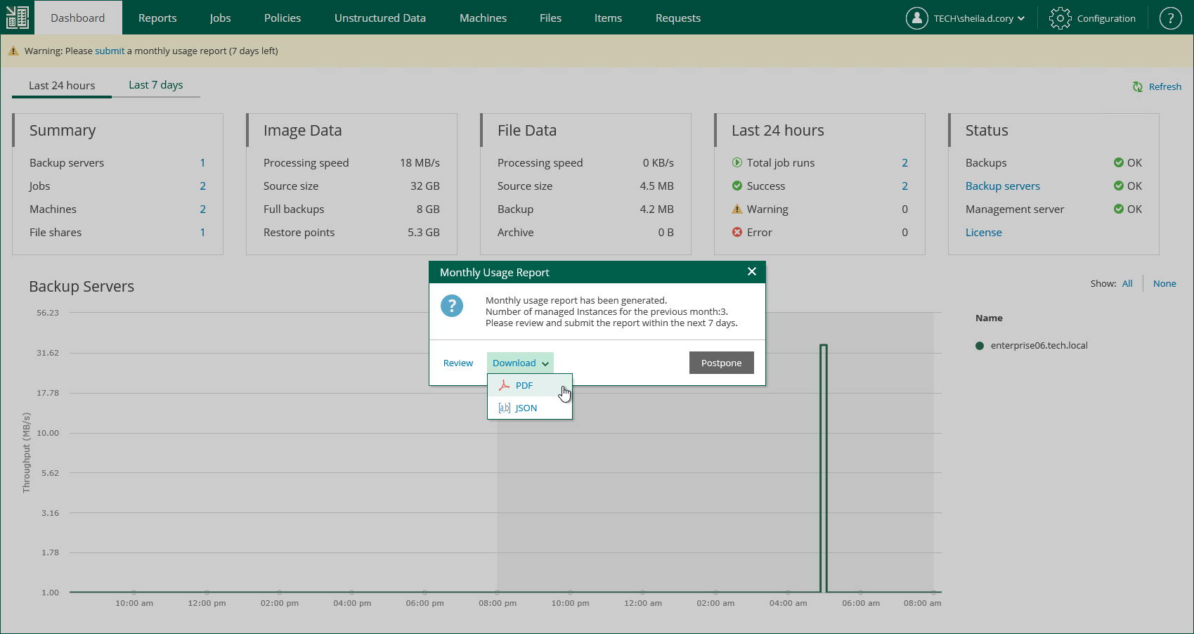 2. Download the report. The procedure differs depending on the reporting method. For more information, see the License Usage Reporting section of the Veeam Cloud Connect Guide.