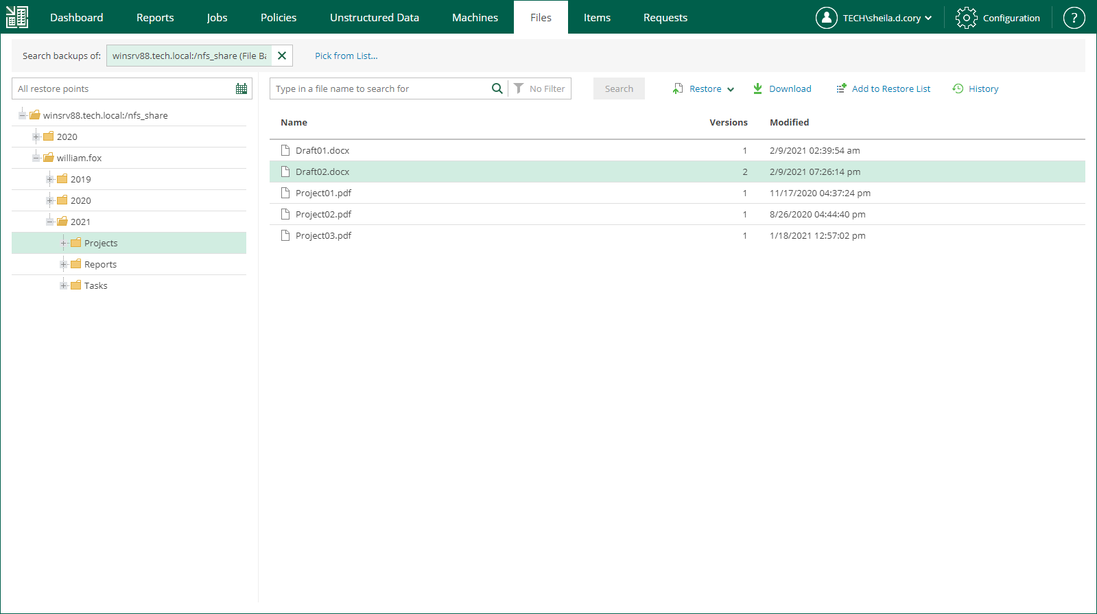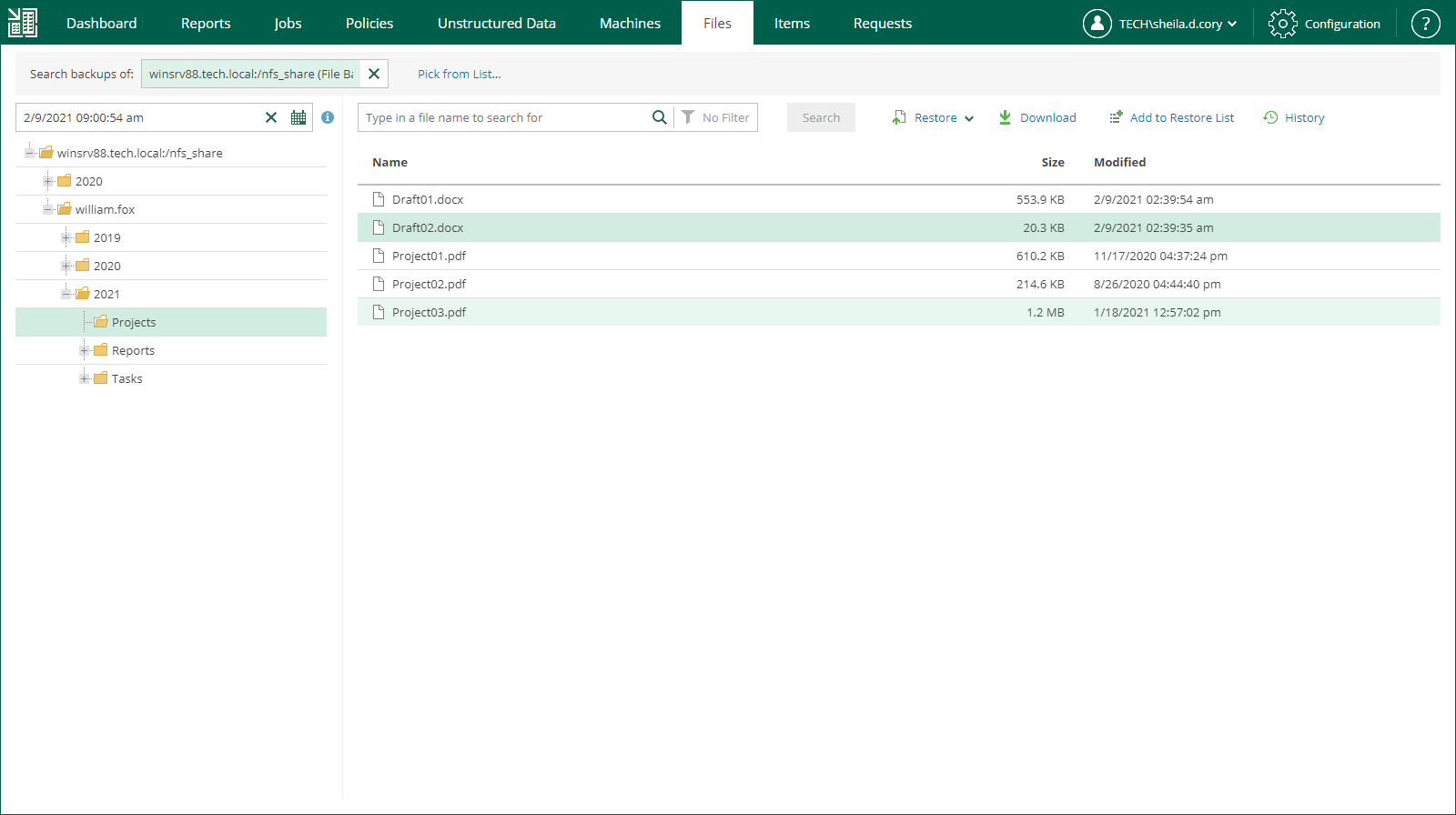 You can use the search field at the top of the working area to search for specific files and folders. Depending on the number of files in the file share, the search process may take some time. For more information, see Searching for Items in Unstructured Data Backups. |