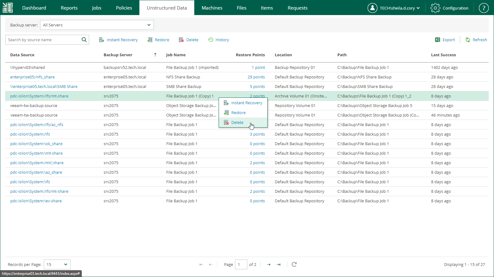 You can delete the data of a file share or object storage from a backup repository. The deleted data source is not removed from the list immediately. It will be removed from the list after the records about the data source are removed from the configuration database of the backup server. Once this operation completes, a notification will appear at the top of the Enterprise Manager window.