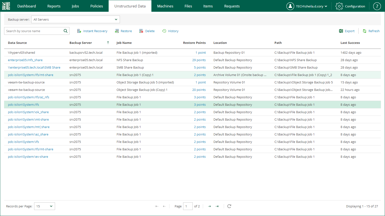 From Veeam Backup Enterprise Manager, you can view information about unstructured data (file shares and object storage systems) processed by backup jobs configured on added backup servers. You can view backed up unstructured data on the Unstructured Data tab.