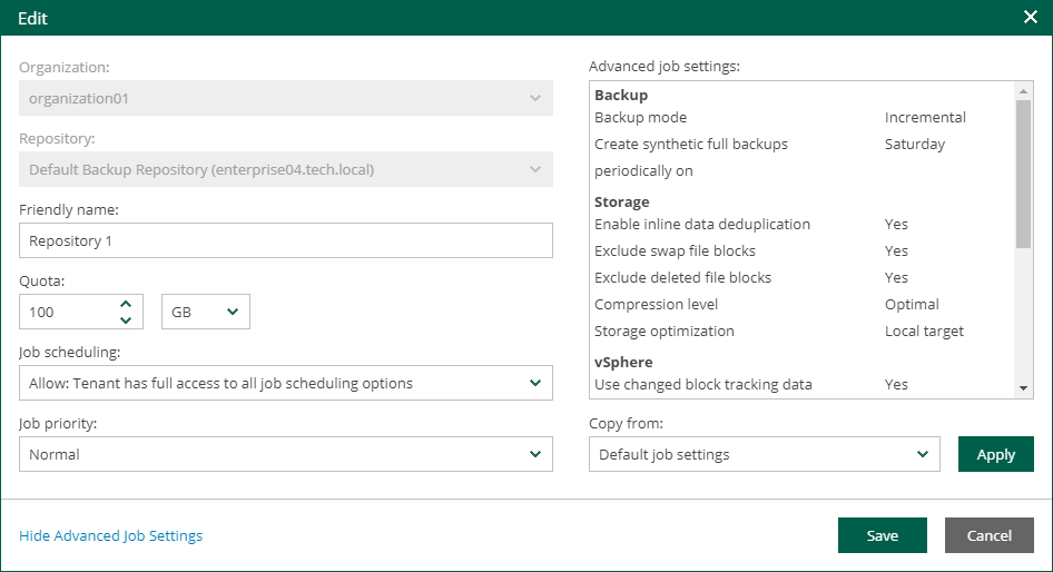 - When you change a job template for a Cloud Director organization, the new configuration will be applied only to the new jobs, existing jobs will not be affected.