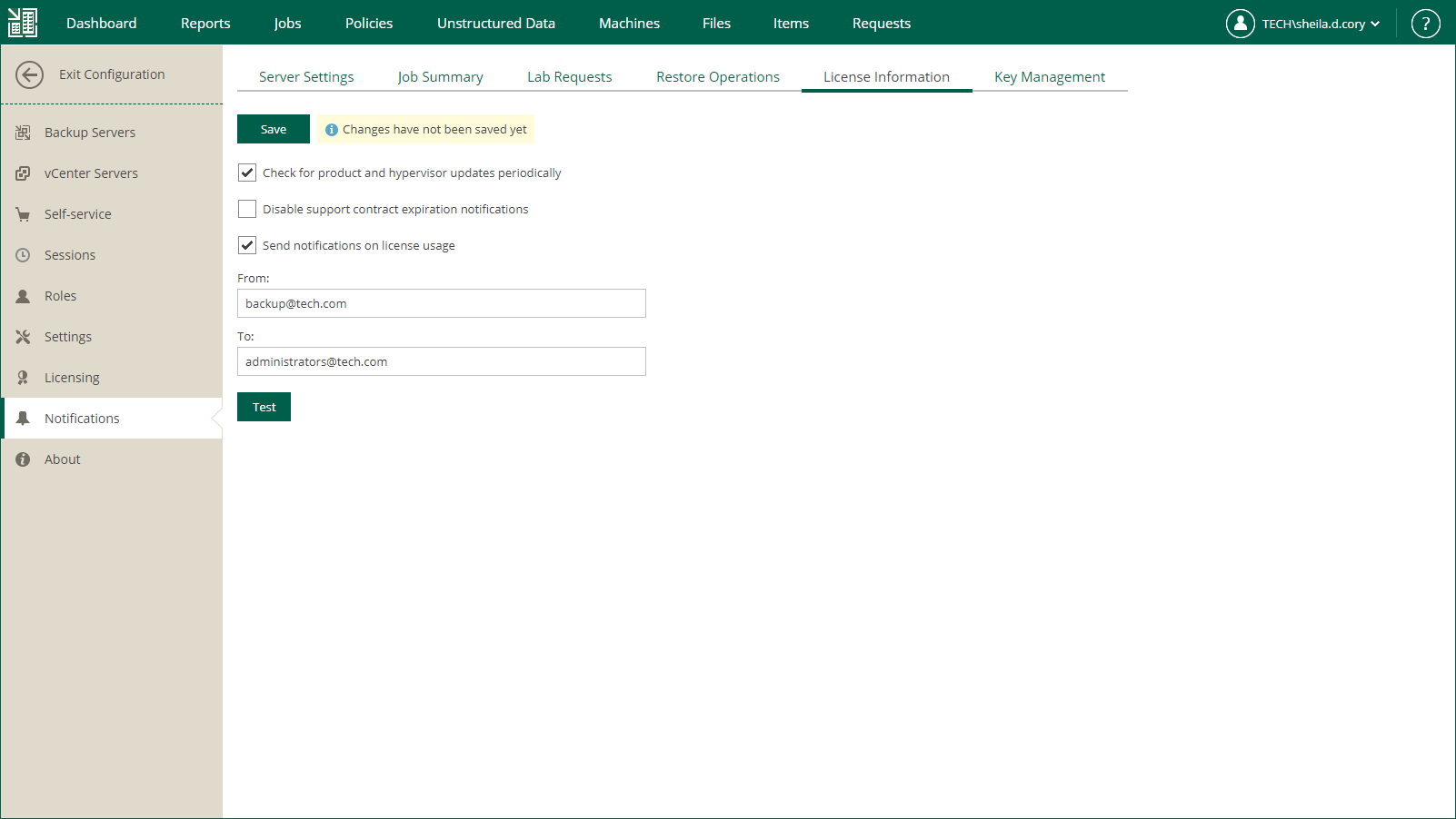 To verify that you have configured email settings correctly, click Test. Veeam Backup Enterprise Manager will send a test email message to all specified email addresses. |
