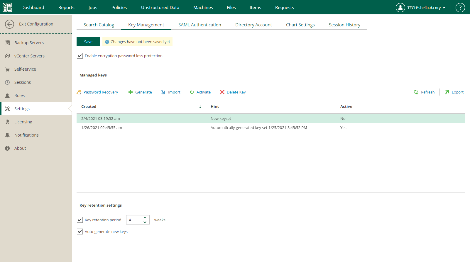 - If you want Veeam Backup Enterprise Manager to automatically generate a new keyset, select the Auto-generate new keys check box. After the current keyset expires, Veeam Backup Enterprise Manager will automatically generate a new keyset and mark it as active. During the next data synchronization session, Veeam Backup Enterprise Manager will propagate the newly created public Enterprise Manager key to all connected Veeam backup servers. The private Enterprise Manager key will remain on Veeam Backup Enterprise Manager and will be used for data decryption.