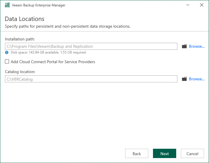 By default, the setup wizard creates the VBRCatalog folder on a volume with the maximum amount of free space, for example: C:\VBRCatalog.