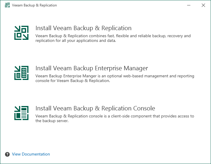 This is an archive version of the document. To get the most up-to-date information, see the current version. Step 2. Select Product At this step of the wizard, select Install Veeam Backup Enterprise Manager.To open Veeam Help Center from the setup wizard, click View Documentation.