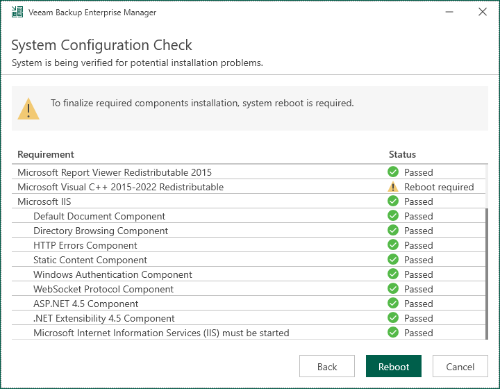 At the System Configuration Check step of the wizard, the setup checks whether required software is installed on the machine. If some of the required components are missing, the setup will try to install them automatically. After the components are installed successfully, reboot is required. When you are ready to reboot the machine, click Reboot.