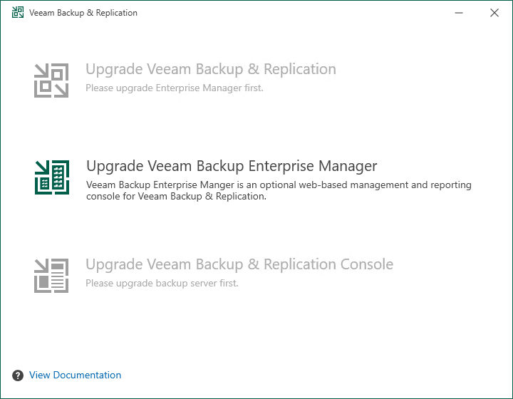 This is an archive version of the document. To get the most up-to-date information, see the current version. Step 2. Select Product At this step of the wizard, select Upgrade Veeam Backup Enterprise Manager.To open Veeam Help Center from the upgrade wizard, click View Documentation.