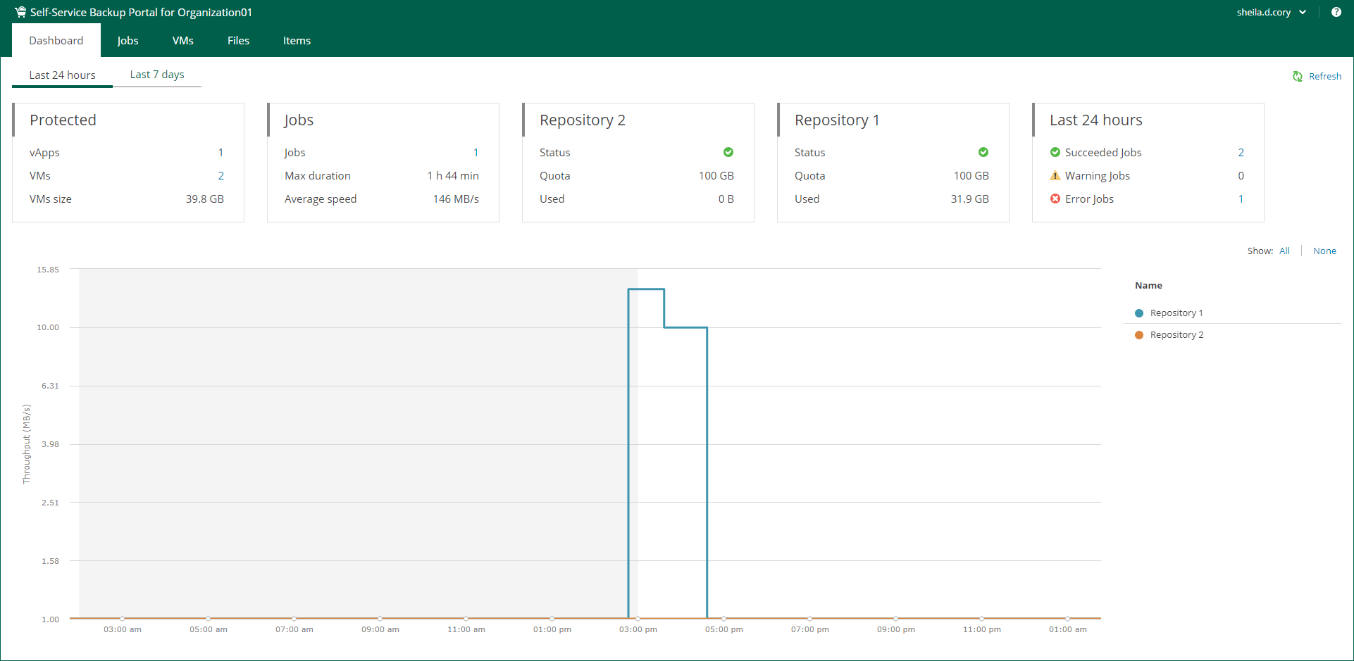 To visualize on-going jobs data, the Dashboard tab also comprises a chart showing date and time when jobs were performed, and the network throughput rate during the job.