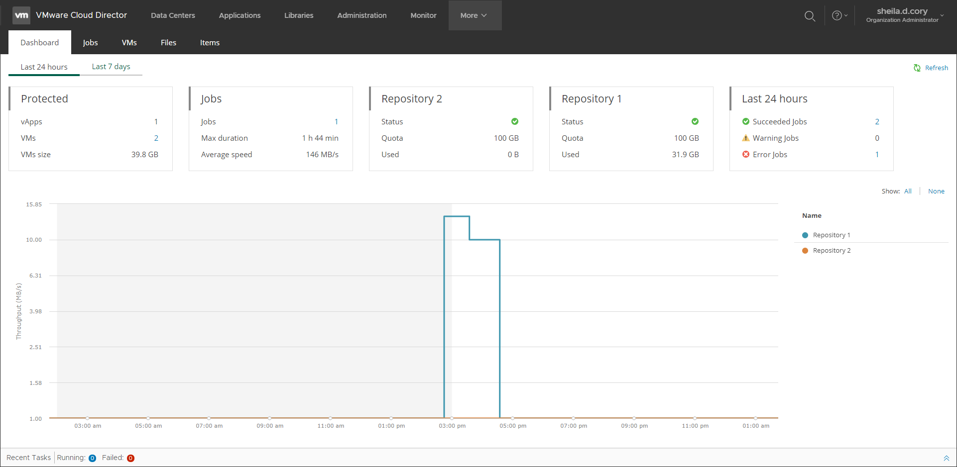 The Dashboard tab contains statistics on VMware Cloud Director backup jobs, replication jobs, and CDP policies of your Cloud Director organization, including information on protected VMs, job runs, and backup repositories.