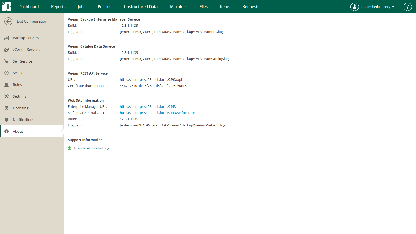 You can view detailed information about Enterprise Manager and its components, URLs of REST API and Veeam Self-Service File Restore Portal, as well as the paths to the Enterprise Manager logs.