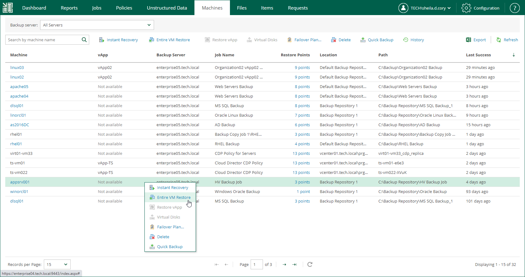 This is an archive version of the document. To get the most up-to-date information, see the current version. Step 1. Launch Entire VM Restore Wizard To launch the Entire VM Restore wizard, do the following:Open the Machines tab and select the necessary Microsoft Hyper-V VM from the list.On the toolbar, click Restore.Alternatively, you can right-click the VM and select Entire VM Restore.