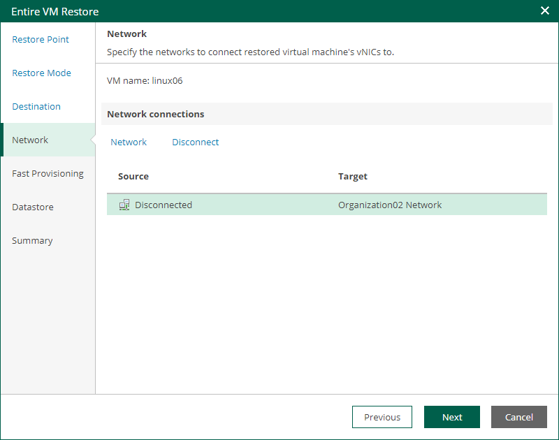 The Network step of the wizard is available if you restore a VM to a new location or with different settings.