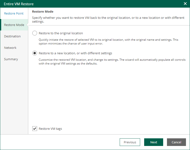 At the Restore mode step, specify a destination for VM recovery and select whether you want to recover VM tags.