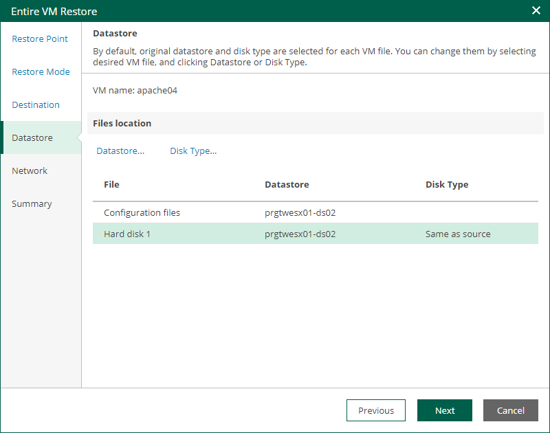 At this step of the wizard, you can specify target datastore for VM configuration files and VM disk files, as well as change the disk type (provisioning policy) for the recovered VM. By default, Veeam Backup & Replication uses the datastore and disk type settings of the original VM. You can place an entire VM to a particular datastore or choose to store configuration files and disk files of the restored VM in different locations.