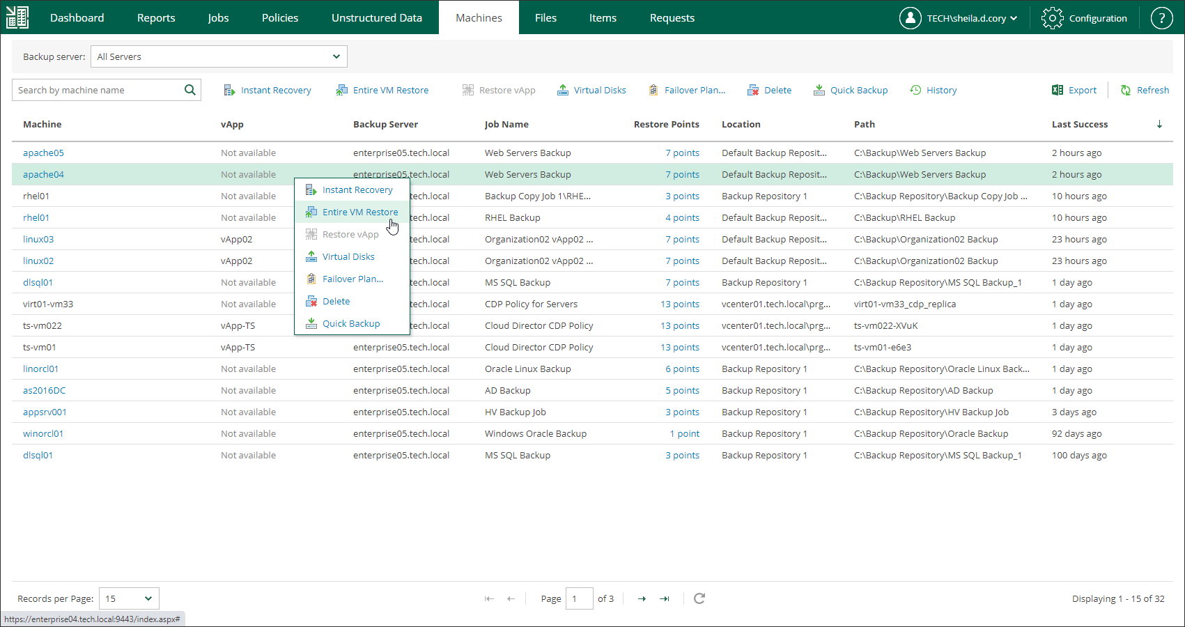This is an archive version of the document. To get the most up-to-date information, see the current version. Step 1. Launch Entire VM Restore Wizard To launch the Entire VM Restore wizard, do the following:Open the Machines tab and select the necessary VMware vSphere VM from the list.On the toolbar, click Restore.Alternatively, you can right-click the VM and select Entire VM Restore.